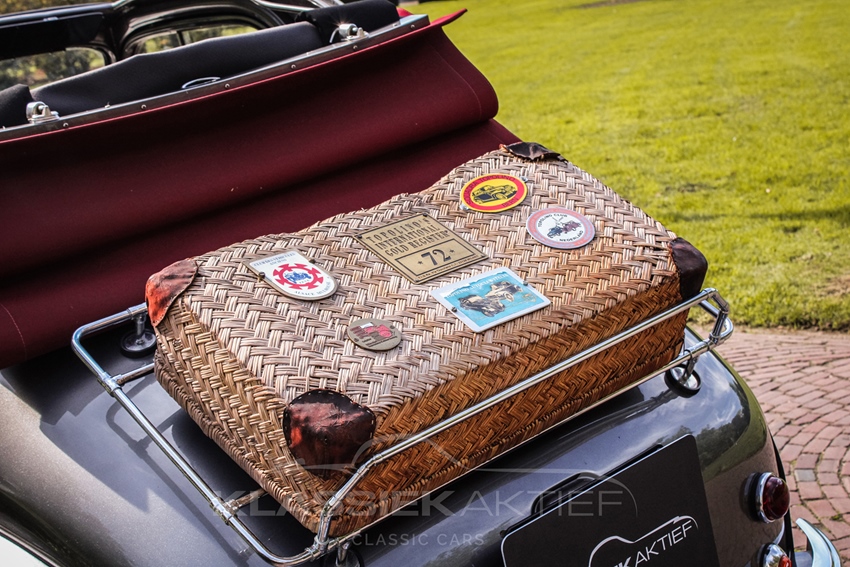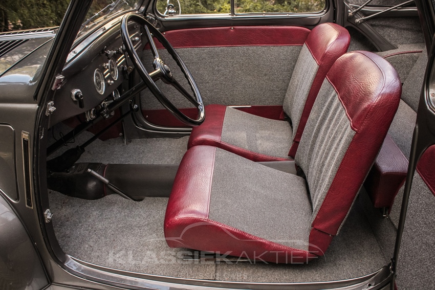 Het interieur is in perfecte en bijna nieuwe conditie. De rood/grijze bekleding is in uitmuntende conditie en is werkelijk schitterend om te zien. De bekleding is een combinatie van stof (grijs) en skaileder (rood) en dat geeft de auto een stijlvol karakter. De stoelen zijn niet alleen in perfecte conditie, maar zitten verrassend comfortabel. Het dashboard is ook in uitzonderlijk mooie conditie. De diverse chroom- en sierdelen zijn in zeer goede conditie. Via de achterbank is er toegang tot een kleine opbergruimte beschikbaar.