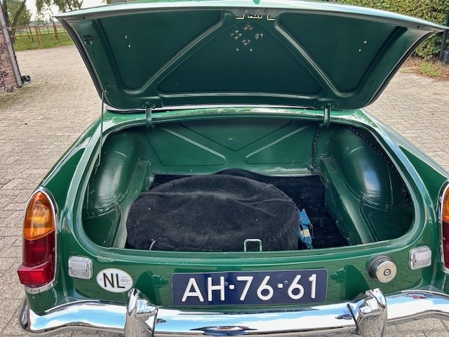 Zeer nette MGB van 1969 met overdrive in British Racing Green. Het is een oudere restauratie, een MG die zeer goed bewaard is gebleven. De auto is meer dan 20 jaar van hetzelfde echtpaar geweest. Zij hebben hem keurig onderhouden. De motor rijdt bijzonder soepel en de overdrive versnellingsbak schakelt perfect. Een zorgeloze, technisch zeer goede auto. De auto is voorzien van 2 HS4 carburateurs met K&N filters, een sportieve upgrade. De auto heeft als extra ene rembekrachtiger ingebouwd, een enorme verbetering. Het plaatwerk is zeer netjes met wat minimale imperfecties. De British Racing Groene kleur staat hem geweldig met de chrome accenten. De chrome Dunlop spaakwielen , bumpers , grille , bagagerek en chromen dorpel covers steken prachtig af bij het groen. Het interieur is uitgerust in zwart vinyl en is erg netjes . Zeer nette stoelen , een zeer nette zwarte vinyl softtop en full tonneau cover. Het houten Moto Lita stuur is het ultieme feature voor elke Engelse ex klassieker. De auto is voor de veiligheid voorzien van een roll bar, deze is geschroefd en kan desgewenst gemakkelijk verwijderd worden.