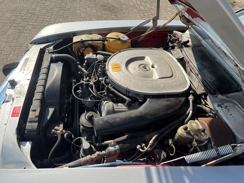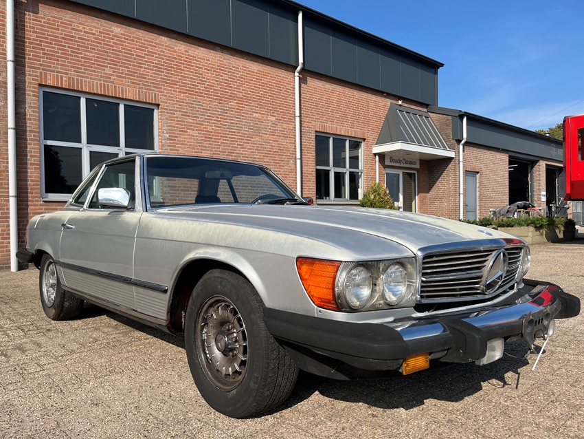 Roestvrije Mercedes 380 SL, gebouwd in april 1984 en afkomstig uit Californië. Oorspronkelijk rood met zwart leder, later overspoten in zilvergrijs. De lak is verweerd en de auto dient volledig opnieuw te worden gespoten – ideaal om terug te brengen naar de originele kleurstelling.