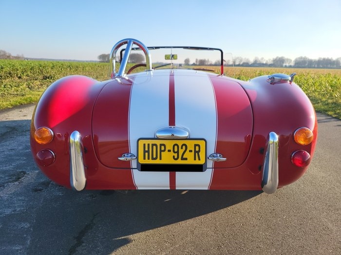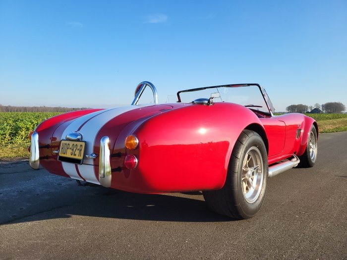 Shelby Cobra 427 Replica 1992 Deze Cobra is gebouwd door Classic Roadsters LTD in Fargo, USA en is werkelijk een prachtige verschijning. In de ultieme kleurencombinatie rood / wit. Carrosserie: De carrosserie is in bijna perfecte staat, lichte steenslag aan de voorzijde, maar geen rare plekken of krassen. De witte strepen zijn prachtig meegespoten in de lak. De passingen van de deuren en motorkap en kofferklep zijn prima en zoals het hoort. Motorisch: De Cobra is voorzien van een 427 (7.0) Liter V8 met injectie. Deze is genoeg om 261 KW op te brengen en je in je stoel te drukken. Deze V8 is gekoppeld aan een handgeschakelde Tremec 5-versnellingsbak waarmee de combinatie compleet is. Vooral als het luchtfilter verwijderd is, en de 8 prachtige inlaatkelken zichtbaar worden, toont het motorblok zijn schoonheid. Zo heeft Caroll Shelby in 1965 ook de originele Cobra bedacht. Enkel heeft deze Cobra injectie in plaats van een carburateur motor waarmee deze wel weer een stuk betrouwbaarder. Interieur: Het interieur is zeer mooi, met originele kuipstoelen en Houten stuurwiel. Het dashboard is mooi leder gestoffeerd en straalt luxe uit. evenals de meter met hun chromen uitstraling. Bij de Cobra word ook het originele dekzeil geleverd. Deze is ook te zien bij de foto's, deze kun je met drukknoppen monteren en eventueel de bestuurders of bijrijders kant open-ritsen. Onderstel: De bodem van de Cobra is zeer netjes, en heeft geen rare plekken of beschadigingen. En is opgebouwd met een ''boxed frame'' dus sterker als de reguliere Cobra's. De banden zijn in zeer goede conditie. Evenals de originele gegoten velgen. Kenteken/registratie: De Cobra is door ons geïmporteerd en door ons bij de Nederlandse RDW (Rijks Dienst Wegverkeer) volledig gekeurd en nagekeken. Dus deze Cobra kan overal in Europa geregistreerd worden met deze Europese Toelating. Hij komt rechtstreeks uit de Verenigde Staten, dus het is een schone registratie. De auto is dus met USA papieren geïmporteerd naar Nederland. Ook voor Hulp bij transport of registratie kunnen wij als verkopende partij u bij helpen. Kortom een prachtige zeldzame auto op Nederlands kenteken, klaar voor de komende zomermaanden