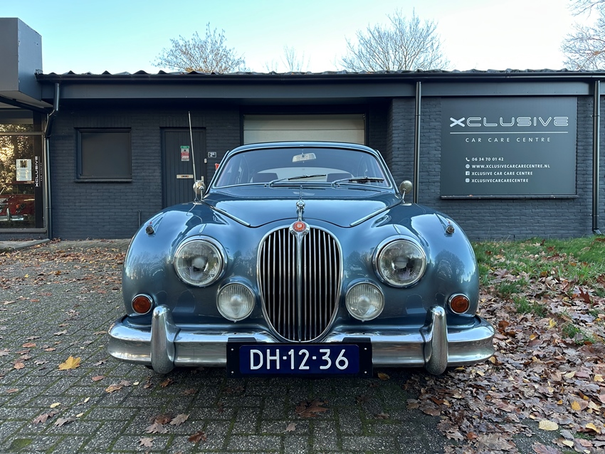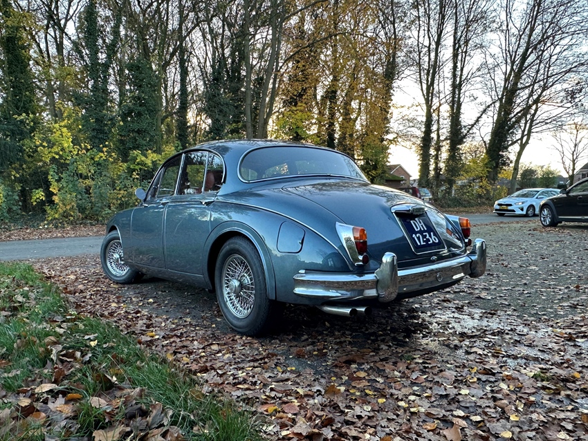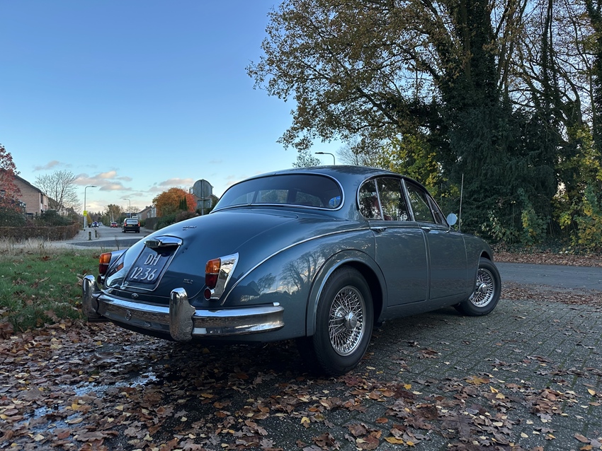 Het gaat om een prachtige Jaguar MK2 Saloon, handgeschakeld (4 versnellingen) met overdrive en een geweldige 3.4 liter 6 cilinder lijn motor!