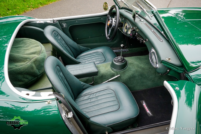 Carrosseriekleur British Racing Green boven zwart gecombineerd met een donkergroen lederen interieur afgewerkt met zwarte biezen en licht groen tapijt.