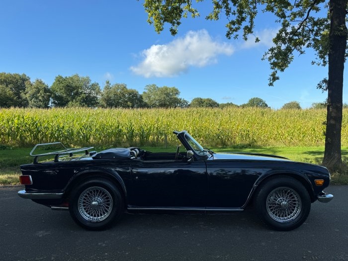 Unieke Triumph TR6 Roadster uit 1974 aangeboden. Deze Triumph TR6 is uitgerust met Overdrive, een zeer krachtige 122 pk 6-cilinder motor met 3 Webers en met een roestvrijstalen dubbel uitlaatsysteem, Royal blue lakwerk en bevindt zich in goede gebruikte staat. Voorzien van 4 chromen spaakvelgen en goede banden. Deze geweldige TR6 is werkelijk een beleving om in te rijden. heeft chromen voor en achterbumpers, chromen tex spiegels en goede rubbers. het lakwerk is in redelijk goede staat met gebruikersporen (oudere restauratie) en geleverd in Royal blue. Deze kleurencombinatie is echt prachtig! deze donker blauwe lak gecombineerd met chromen details en zwart lederen sportstoelen. Buitenkant: De TR6 heeft jaren in een garage opgeslagen gestaan, is door ons volledig nagekeken, Deze Triumph TR6 heeft origineel chroom met gebruikers sporen nette originele chromen spaak velgen, chromen details, goed hang- en sluitwerk. Originele Lucas koplampen, roestvrijstalen dubbel uitlaatsysteem met een prachtig diep geluid en een Monza brandstofdop. De soft-top is perfect en vervangen door een Mohair type in donker blauw. Ook is er een softtop cover aanwezig! het kofferrek op de fotos is aanwezig maar inmiddels verwijderd, deze krijgt u er uiteraard bij! De bodem is solide met rood gepoedercoat chassis. Interieur: Het interieur beschikt over twee originele lederen stoelen met hoofdsteun, een noten dashboard met originele Smiths tellers, overdrive aan de pookknop, lederen handrem-hoes. bestuurder stoel heeft een kleine beschadiging in de wang rechts. Inclusief originele zwarte tapijtset en nette zwarte deurkaarten. Prachtig houten stuurwiel. Interieur en exterieur beide in een oude gerestaureerde staat, enige (bijgewerkte) plekjes en beschadigingen aanwezig. Techniek: De 3 dubbele weber uitvoering is afgesteld en fantastisch! het vermogen gaat hiermee van de standaard 100 naar ruim 122PK een beleving om te rijden en een echte Britse sportwagen. Originele 2498cc 6-cilinder motor +/- 122 pk, perfecte handgeschakelde transmissie met 4 versnellingen en overdrive en chromen kleppendeksel. De Techniek is nagekeken in onze werkplaats en heeft een complete onderhoudsbeurt gehad. 3 weber carburateurs 4 chromen spaakwielen Olie koeler Conversie set achterschokbrekers Teneau cover Electronische Lumenition ontsteking Nieuwe rembekrachtiger Nieuwe rempomp Nieuwe remklauwen en leidingen Voorraam met donker blauwe schaduwband Overdrive Dubbele rvs sportuitlaat Details: Deze TR6 is voor de echte 'petrol head', een zeer nette Engelse sportwagen met een krachtige 2.5 liter motor en prachtige kleuren (Royal Blue) lakwerk in gebruikte staat. Oorspronkelijk komt deze TR6 uit Duitsland, waarna hij in Nederland is geregistreerd. De auto is altijd goed onderhouden en gestald in een verwarmde garage. Een prachtige kans voor de liefhebber met weinig moeite weer in topstaat te maken. U bent van harte welkom deze Triumph te komen bekijken en een uitgebreide proefrit te maken voor u gaat bieden! neem hiervoor contact op met Catawiki inclusief: Export documenten Enkele workshop manuals Oudere taxatierapporten Restauratie fotos Transport: Wij bieden verschillen transport oplossingen door heel Europa en daarbuiten! heeft u interesse in een transport of prijsopgave horen wij dat graag, wij vragen dan een prijs op bij een van onze transport partners. neem hiervoor contact op met Catawiki. Bieden: Wij raden kopers altijd aan de wagen alvorens te bieden te bezichtigen en een proefrit te maken, zet en drukfouten voorbehouden. Wij maken graag aanvullende fotos of een korte video indien u hierom verzoekt. Locatie: De Tr6 staat in Rogat, Nederland (1,5 uur rijden van Amsterdam/Schiphol)