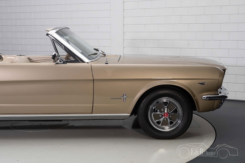 1966 Ford Mustang Cabriolet in Sauterne Gold te koop Zoals u op de foto's kunt zien is deze Ford Mustang Cabriolet echt een plaatje om te zien. De Mustang is uitgevoerd in de prachtige kleur Sauterne Gold. Een kleur die geweldig staat op deze klassieker en hem een onderscheidend karakter geeft. Het chroomwerk knalt eruit op deze Mustang en combineert prachtig met het Sauterne Gold lakwerk. Het interieur van de Mustang Cabriolet verkeert in een zeer goede staat en is voorzien van beigekleurige 'Pony' bekleding en een houten stuurwiel. Om het geheel af te maken is de Mustang uitgerust met een hydraulische witte soft top zodat u bij mooi weer heerlijk kunt genieten van de buitenlucht tijdens het toeren.