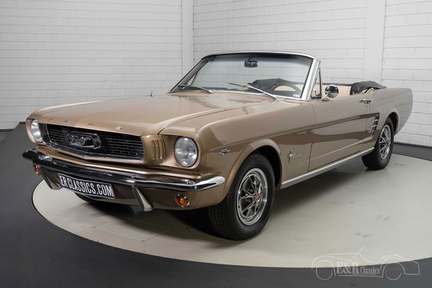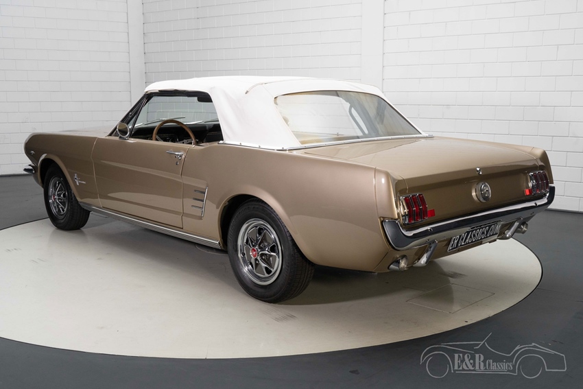 1966 Ford Mustang Cabriolet in Sauterne Gold te koop Zoals u op de foto’s kunt zien is deze Ford Mustang Cabriolet echt een plaatje om te zien. De Mustang is uitgevoerd in de prachtige kleur Sauterne Gold. Een kleur die geweldig staat op deze klassieker en hem een onderscheidend karakter geeft. Het chroomwerk knalt eruit op deze Mustang en combineert prachtig met het Sauterne Gold lakwerk. Het interieur van de Mustang Cabriolet verkeert in een zeer goede staat en is voorzien van beigekleurige ‘Pony’ bekleding en een houten stuurwiel. Om het geheel af te maken is de Mustang uitgerust met een hydraulische witte soft top zodat u bij mooi weer heerlijk kunt genieten van de buitenlucht tijdens het toeren.