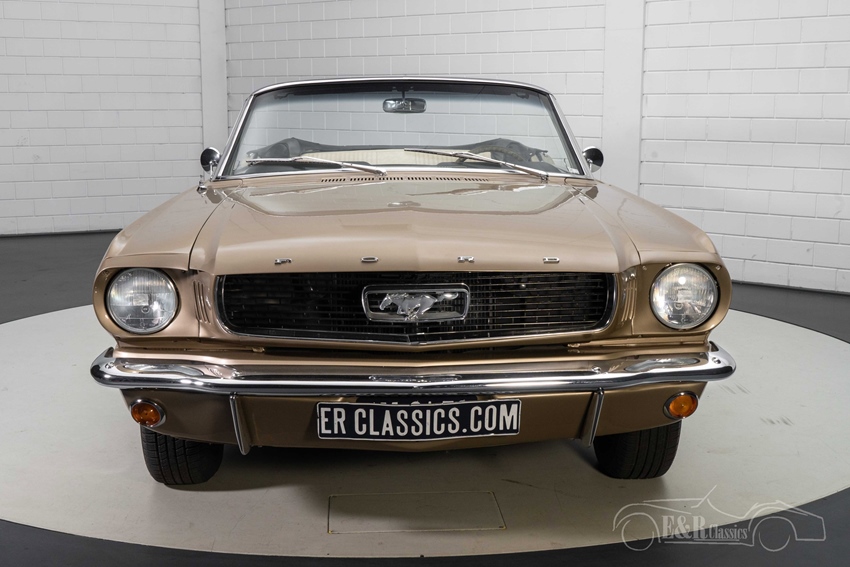 1966 Ford Mustang Cabriolet in Sauterne Gold te koop Zoals u op de foto's kunt zien is deze Ford Mustang Cabriolet echt een plaatje om te zien. De Mustang is uitgevoerd in de prachtige kleur Sauterne Gold. Een kleur die geweldig staat op deze klassieker en hem een onderscheidend karakter geeft. Het chroomwerk knalt eruit op deze Mustang en combineert prachtig met het Sauterne Gold lakwerk. Het interieur van de Mustang Cabriolet verkeert in een zeer goede staat en is voorzien van beigekleurige 'Pony' bekleding en een houten stuurwiel. Om het geheel af te maken is de Mustang uitgerust met een hydraulische witte soft top zodat u bij mooi weer heerlijk kunt genieten van de buitenlucht tijdens het toeren.