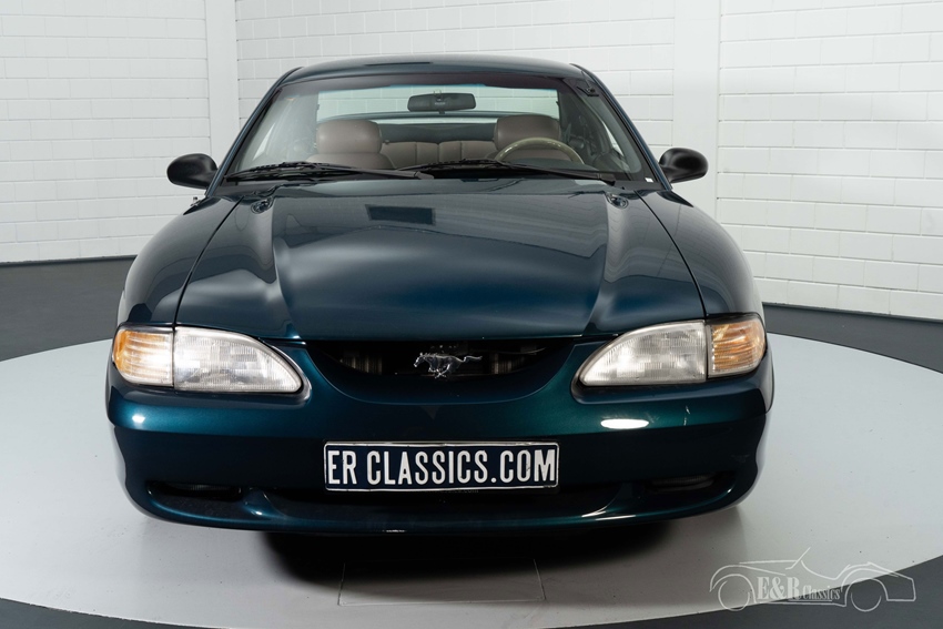 Ford Mustang GT in Deep Forest Green te koop De Ford Mustang GT die we hier te koop aanbieden is een echte eyecatcher. Hij is uitgevoerd in de prachtige fabriekskleur Deep Forest Green. Een donkergroene metallic kleur die erg mooi staat op deze auto. Hij is tevens voorzien van de originele lichtmetalen velgen en achterspoiler die hem een sportieve look geeft. Het Tan-kleurig lederen interieur verkeert in een nette staat en combineert erg mooi met het donkergroene lakwerk. Deze Mustang GT is tevens uitgerust met een aantal gewilde opties zoals airconditioning, elektrisch bedienbare ramen en cruise control.