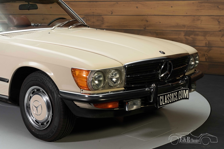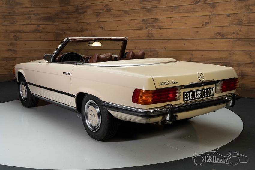Beigekleurige Mercedes-Benz 350 SL te koop Wat deze Mercedes-Benz 350 SL onderscheidt van de rest is toch wel zijn leuke kleurstelling. Hij is uitgevoerd in een beigekleurig lakwerk en heeft een donkerbruin interieur. Het interieur combineert prachtig met dit lakwerk en ook de donkerbruine soft top past helemaal bij het totaalplaatje. Het lakwerk en interieur vertonen hier en daar wat gebruikssporen.