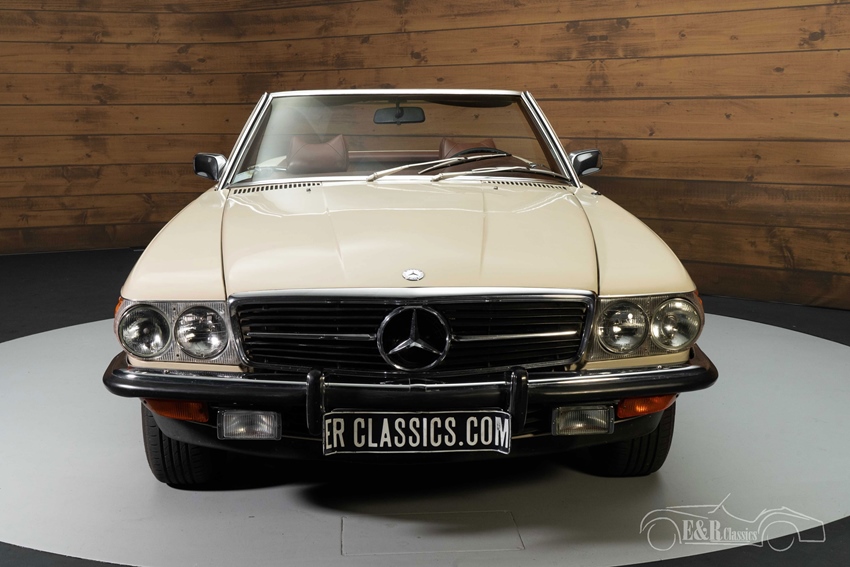 Beigekleurige Mercedes-Benz 350 SL te koop Wat deze Mercedes-Benz 350 SL onderscheidt van de rest is toch wel zijn leuke kleurstelling. Hij is uitgevoerd in een beigekleurig lakwerk en heeft een donkerbruin interieur. Het interieur combineert prachtig met dit lakwerk en ook de donkerbruine soft top past helemaal bij het totaalplaatje. Het lakwerk en interieur vertonen hier en daar wat gebruikssporen.
