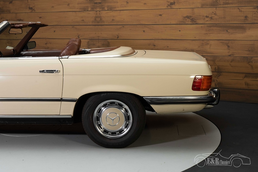 Beigekleurige Mercedes-Benz 350 SL te koop Wat deze Mercedes-Benz 350 SL onderscheidt van de rest is toch wel zijn leuke kleurstelling. Hij is uitgevoerd in een beigekleurig lakwerk en heeft een donkerbruin interieur. Het interieur combineert prachtig met dit lakwerk en ook de donkerbruine soft top past helemaal bij het totaalplaatje. Het lakwerk en interieur vertonen hier en daar wat gebruikssporen.