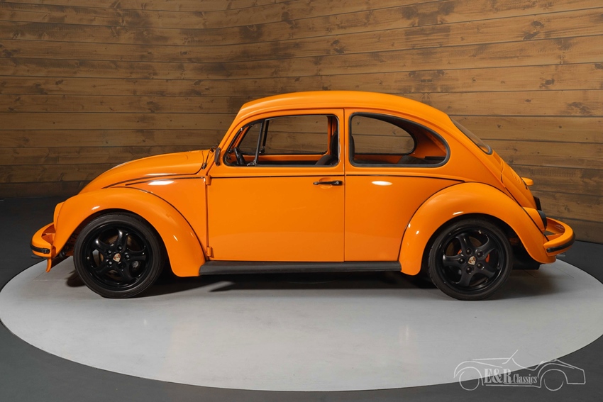 Het uiterlijk van deze VW Kever past ook helemaal bij zijn sportieve prestaties. Er is gekozen voor Porsche GT3 RS oranje, een geweldige combinatie met de zwarte Porsche velgen. Het donkere interieur en vloermatten met oranje piping maken er een mooi geheel van.