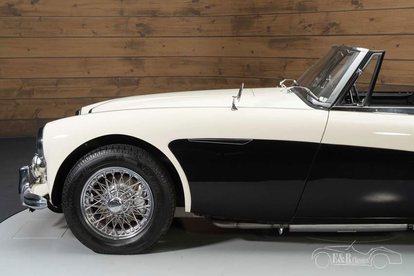 Austin-Healey 3000 MK3 in Old English White te koop De Austin-Healey 3000 MK3 die we hier te koop aanbieden is uitgevoerd in de prachtige kleur Old English White. Om de auto extra karakter te geven is er gekozen voor een zwart vlak op de zijkant wat er een echte eyecatcher van maakt. De chromen spaakwielen en accessoires maken de klassieke look compleet. Het interieur verkeert in een nette, originele staat en heeft een notenhouten dashboard. De bekleding vertoont hier en daar wat kleine gebruikssporen. Er is een nieuwe soft top geplaatst die u in een handomdraai inklapt zodat u heerlijk kunt genieten van de buitenlucht tijdens het toeren.