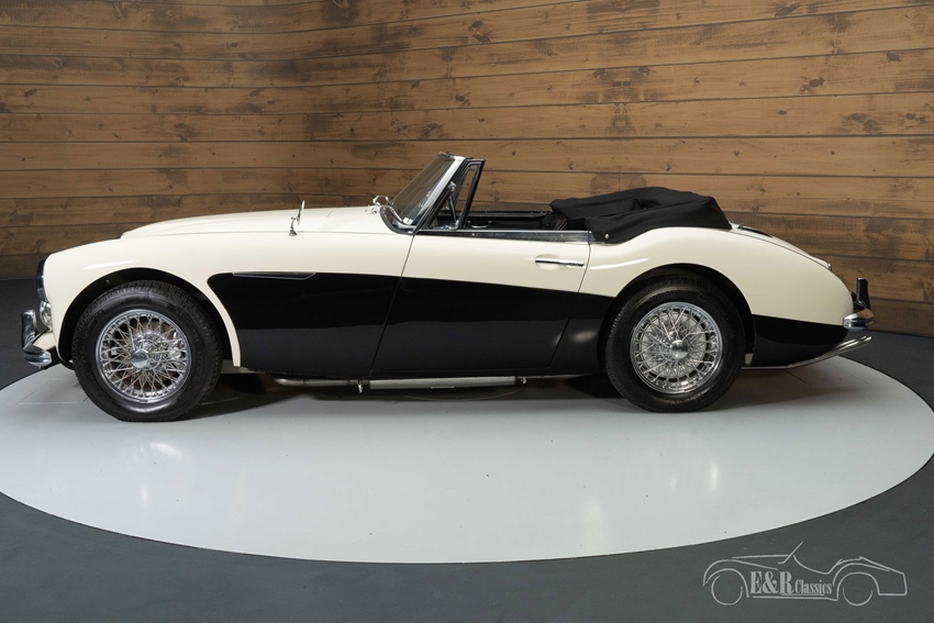 Austin-Healey 3000 MK3 in Old English White te koop De Austin-Healey 3000 MK3 die we hier te koop aanbieden is uitgevoerd in de prachtige kleur Old English White. Om de auto extra karakter te geven is er gekozen voor een zwart vlak op de zijkant wat er een echte eyecatcher van maakt. De chromen spaakwielen en accessoires maken de klassieke look compleet. Het interieur verkeert in een nette, originele staat en heeft een notenhouten dashboard. De bekleding vertoont hier en daar wat kleine gebruikssporen. Er is een nieuwe soft top geplaatst die u in een handomdraai inklapt zodat u heerlijk kunt genieten van de buitenlucht tijdens het toeren.