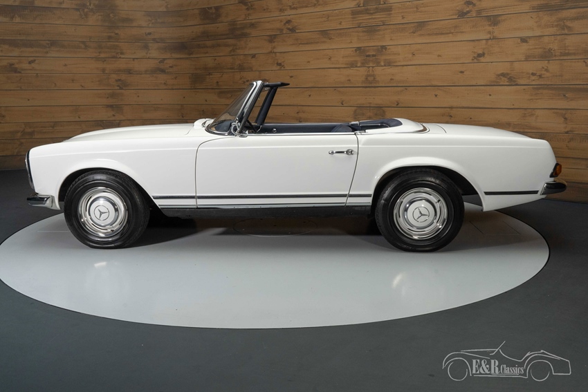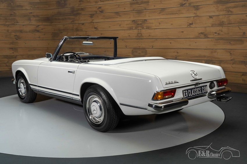 Mercedes-Benz 230 SL met nieuw interieur te koop De Mercedes-Benz 230 SL Pagode die we hier te koop aanbieden is uitgevoerd in een mooi wit lakwerk dat erg goed combineert met de gespoten wielen en het chroomwerk. Hij heeft een zwarte stoffen soft top die u in een handomdraai inklapt zodat u heerlijk kunt genieten van de zon tijdens het toeren. Het donkerblauwe interieur is recent vernieuwd en steekt prachtig af tegen het witte lakwerk. Kortom, een mooie Pagode die helemaal klaar is voor zijn nieuwe eigenaar.