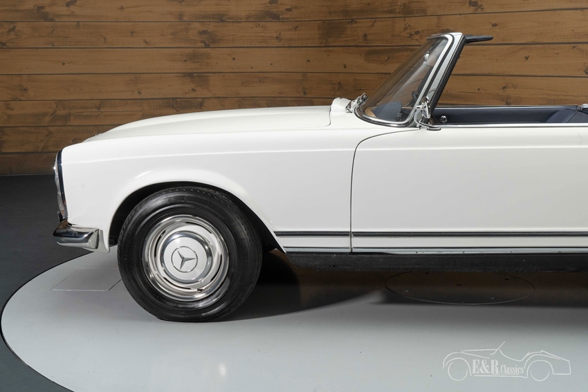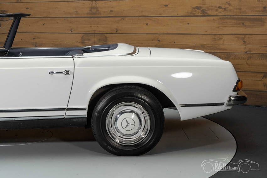 Mercedes-Benz 230 SL met nieuw interieur te koop De Mercedes-Benz 230 SL Pagode die we hier te koop aanbieden is uitgevoerd in een mooi wit lakwerk dat erg goed combineert met de gespoten wielen en het chroomwerk. Hij heeft een zwarte stoffen soft top die u in een handomdraai inklapt zodat u heerlijk kunt genieten van de zon tijdens het toeren. Het donkerblauwe interieur is recent vernieuwd en steekt prachtig af tegen het witte lakwerk. Kortom, een mooie Pagode die helemaal klaar is voor zijn nieuwe eigenaar.