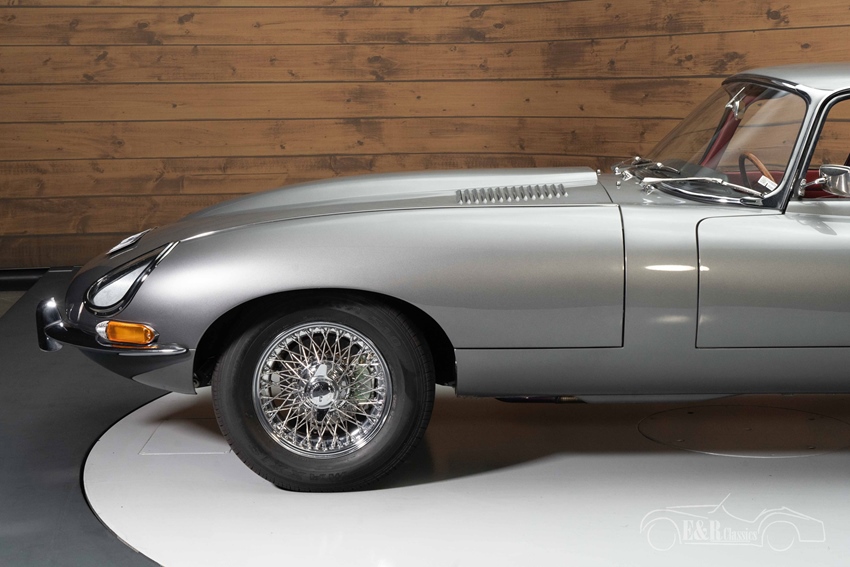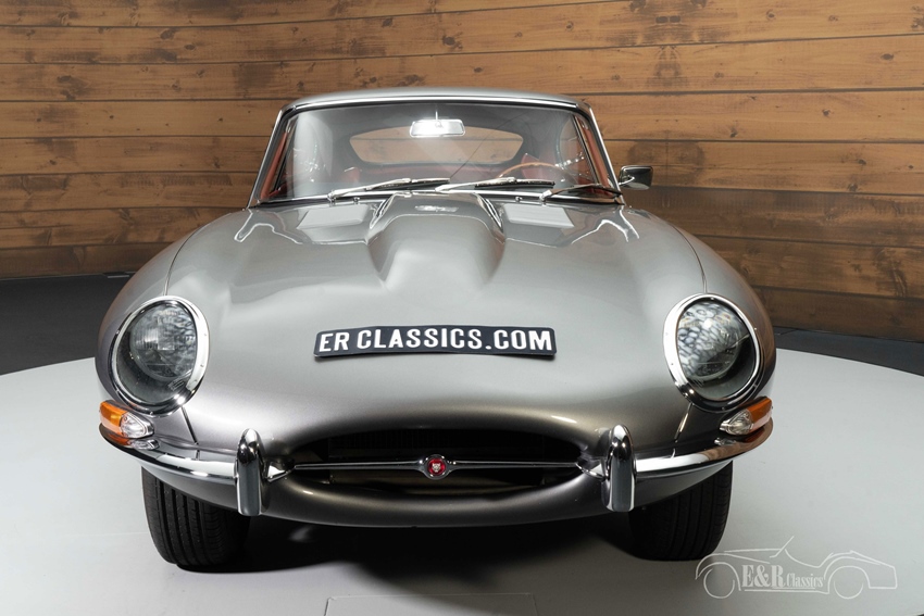 Jaguar E-Type Series 1 Coupe in Gunmetal Grey te koop De Jaguar E-Type Series 1 Coupe die we hier te koop aanbieden is werkelijk een van de beste die op dit moment op de markt wordt aangeboden. De restauratie is van een topniveau en dat is er aan af te zien. De E-Type is uitgevoerd in de prachtige kleur Gunmetal Grey wat geweldig combineert met het chroomwerk en de chromen spaakwielen. Het interieur is uitgerust met rood lederen bekleding wat erg mooi afsteekt tegen het Gunmetal Grey lakwerk. Kortom, een prachtige E-Type Series 1 Coupe in geweldige kleurstelling die helemaal klaar is om de weg op te gaan.
