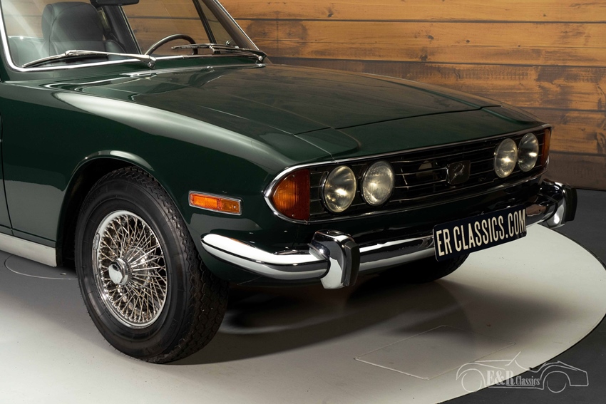 Triumph Stag in British Racing Green te koop De Triumph Stag die we hier te koop aanbieden is zoals een British Classic eruit hoort te zien. Hij is uitgevoerd in de prachtige kleur British Racing Green en staat op een set chromen spaakwielen. Het overige chroomwerk op de auto verkeert in een goede staat. Het interieur van de Stag is uitgerust met zwarte kunstlederen en stoffen bekleding. Het dashboard met houtinleg past helemaal bij een klassieker uit de jaren 70 en het houten sportstuur maakt het totaalplaatje compleet. Naast een zwarte soft top is deze Stag ook voorzien van een hard top in dezelfde kleur als de carrosserie.