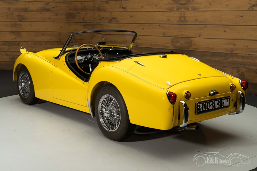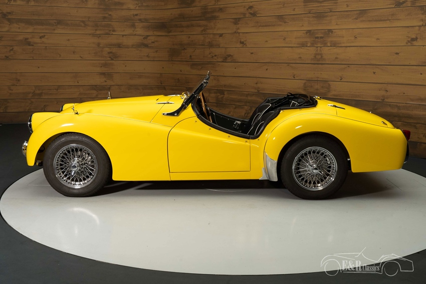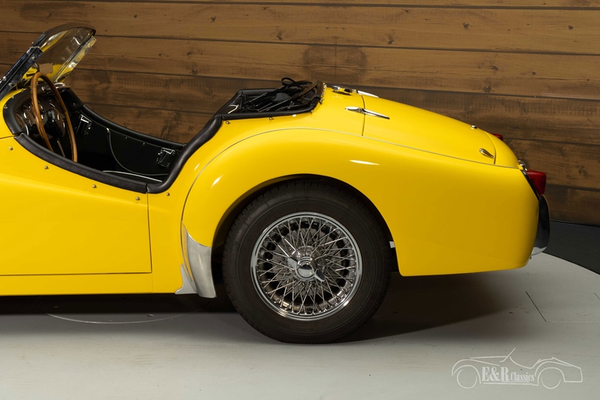 Gele Triumph TR3 te koop De Triumph TR3 die we hier te koop aanbieden is echt een plaatje om te zien. Hij is uitgevoerd in een prachtig geel lakwerk dat een echte eyecatcher van deze klassieker maakt. Het chroomwerk verkeert in een prachtige staat en combineert mooi met het lakwerk. De soft top is uiteraard vernieuwd en zwart van kleur. Het interieur beschikt over zwarte kunstlederen bekleding met witte piping.