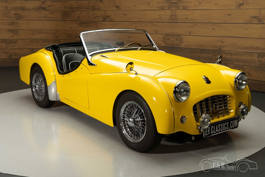 Gele Triumph TR3 te koop De Triumph TR3 die we hier te koop aanbieden is echt een plaatje om te zien. Hij is uitgevoerd in een prachtig geel lakwerk dat een echte eyecatcher van deze klassieker maakt. Het chroomwerk verkeert in een prachtige staat en combineert mooi met het lakwerk. De soft top is uiteraard vernieuwd en zwart van kleur. Het interieur beschikt over zwarte kunstlederen bekleding met witte piping.