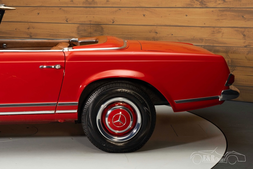 Rode Mercedes-Benz 230 SL te koop De Mercedes-Benz die we hier te koop aanbieden is echt een plaatje om te zien. Hij is uitgevoerd in de prachtige kleur Signal Rot die erg mooi combineert met het chroomwerk en de rode wielen. Het interieur is onlangs nog door onze eigen werkplaats vernieuwd en is uitgevoerd in een mooie donkerbruine kleur. Ook de soft top is donkerbruin uitgevoerd, wat zorgt voor een mooi geheel.
