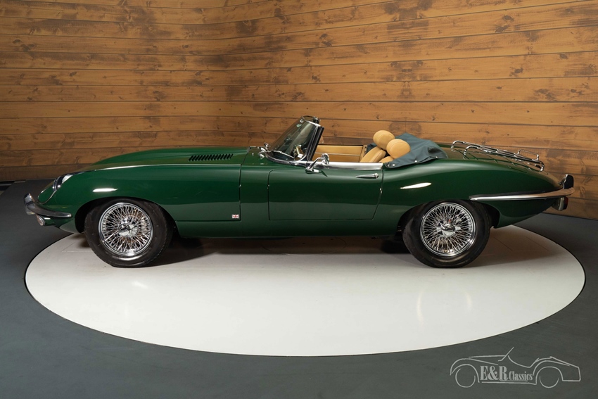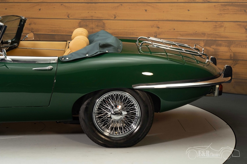 Jaguar E-Type Series 2 Cabriolet in British Racing Green te koop De Jaguar die we hier te koop aanbieden is precies zoals een E-Type eruit hoort te zien: uitgevoerd in de prachtige kleur British Racing Green met een tan lederen interieur. Het donkergroene lakwerk staat prachtig op de klassieker en combineert erg mooi met het chroomwerk en de chromen spaakwielen. Het interieur verkeert in een nette staat en is uitgerust met tan kleurige lederen bekleding en een houten Moto Lita sportstuur. De vorige eigenaar heeft de E-Type geprepareerd voor hobbyritten en heeft onder andere een Rally Tripmaster ingebouwd. Deze kan eventueel gedemonteerd worden.