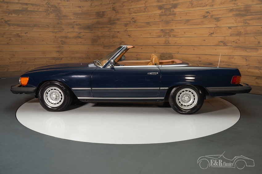 Donkerblauwe Mercedes-Benz 450 SL te koop De Mercedes-Benz die we hier te koop aanbieden is uitgevoerd in een mooi donkerblauw lakwerk dat prachtig staat op de klassieker en mooi combineert met het chroomwerk en de kroonkurk velgen. Het bruine interieur verkeert in een nette staat en steekt mooi af tegen het donkerblauwe lakwerk. De Mercedes-Benz is uitgerust met een donkerbruine soft top die u gemakkelijk inklapt zodra de zon schijnt.