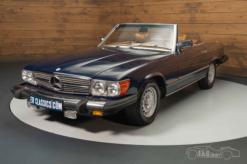 Donkerblauwe Mercedes-Benz 450 SL te koop De Mercedes-Benz die we hier te koop aanbieden is uitgevoerd in een mooi donkerblauw lakwerk dat prachtig staat op de klassieker en mooi combineert met het chroomwerk en de kroonkurk velgen. Het bruine interieur verkeert in een nette staat en steekt mooi af tegen het donkerblauwe lakwerk. De Mercedes-Benz is uitgerust met een donkerbruine soft top die u gemakkelijk inklapt zodra de zon schijnt.