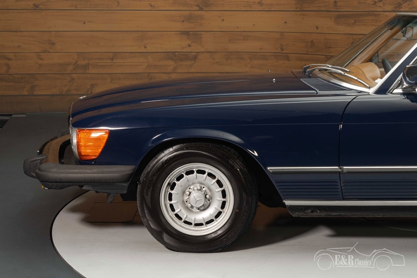 Donkerblauwe Mercedes-Benz 450 SL te koop De Mercedes-Benz die we hier te koop aanbieden is uitgevoerd in een mooi donkerblauw lakwerk dat prachtig staat op de klassieker en mooi combineert met het chroomwerk en de kroonkurk velgen. Het bruine interieur verkeert in een nette staat en steekt mooi af tegen het donkerblauwe lakwerk. De Mercedes-Benz is uitgerust met een donkerbruine soft top die u gemakkelijk inklapt zodra de zon schijnt.