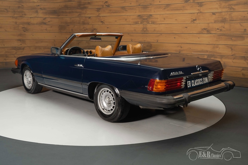 Donkerblauwe Mercedes-Benz 450 SL te koop De Mercedes-Benz die we hier te koop aanbieden is uitgevoerd in een mooi donkerblauw lakwerk dat prachtig staat op de klassieker en mooi combineert met het chroomwerk en de kroonkurk velgen. Het bruine interieur verkeert in een nette staat en steekt mooi af tegen het donkerblauwe lakwerk. De Mercedes-Benz is uitgerust met een donkerbruine soft top die u gemakkelijk inklapt zodra de zon schijnt.