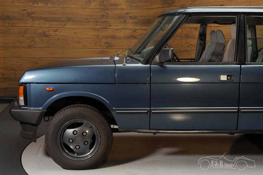 Range Rover Classic in Caspian Blue te koop De klassieke Range Rover die we hier te koop aanbieden verkeert in een originele staat. Hij is uitgevoerd in de originele fabriekskleur Caspian Blue. Het lakwerk bestaat grotendeels uit de eerste lak en heeft wat blaasjes en gebruikssporen rondom. Ook het interieur verkeert in een originele staat en is uitgerust met grijze stoffen bekleding.