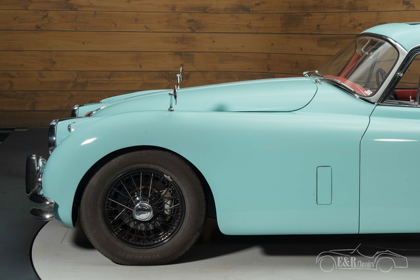 Jaguar XK150 FHC met zeldzaam Webasto schuifdak te koop De Jaguar XK150 FHC die we hier te koop aanbieden is echt een plaatje om te zien. Hij is uitgevoerd in de prachtige kleur Ocean Blue die deze Britse klassieker een uitgesproken karakter geeft. De combinatie met het chroomwerk en de zwart gepoedercoate spaakwielen, maakt er een echte eyecatcher van. Wat helemaal bijzonder is aan deze XK150 is het Webasto schuifdak, dat af-fabriek is geleverd. Het interieur is voorzien van beigekleurig tapijt en bordeaux rood lederen bekleding.