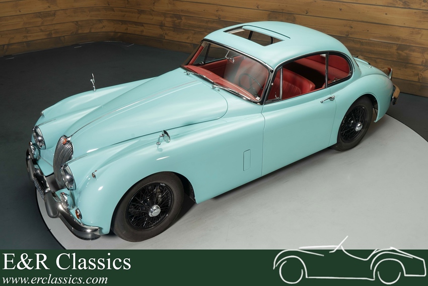 Jaguar XK150 FHC met zeldzaam Webasto schuifdak te koop De Jaguar XK150 FHC die we hier te koop aanbieden is echt een plaatje om te zien. Hij is uitgevoerd in de prachtige kleur Ocean Blue die deze Britse klassieker een uitgesproken karakter geeft. De combinatie met het chroomwerk en de zwart gepoedercoate spaakwielen, maakt er een echte eyecatcher van. Wat helemaal bijzonder is aan deze XK150 is het Webasto schuifdak, dat af-fabriek is geleverd. Het interieur is voorzien van beigekleurig tapijt en bordeaux rood lederen bekleding.