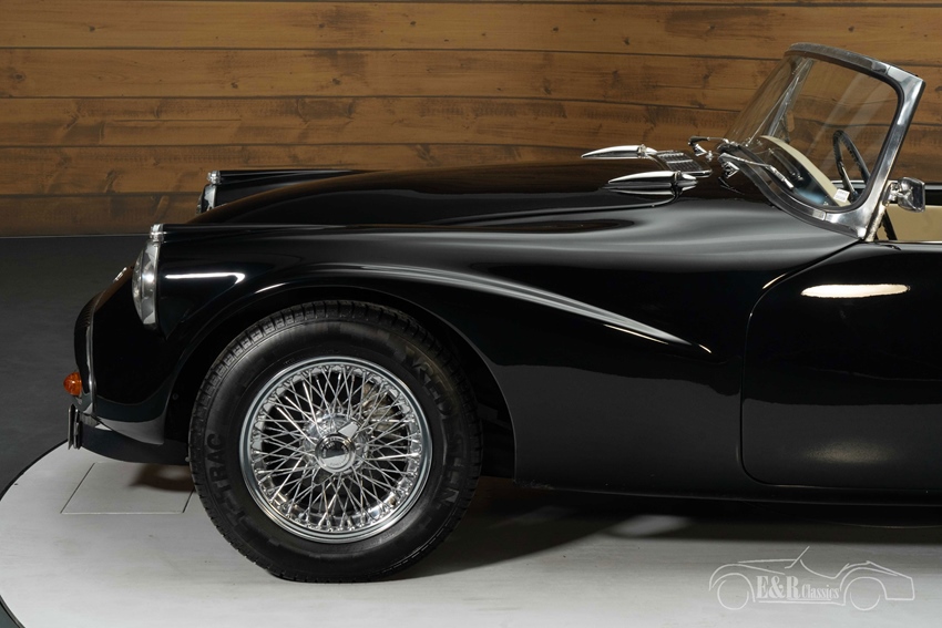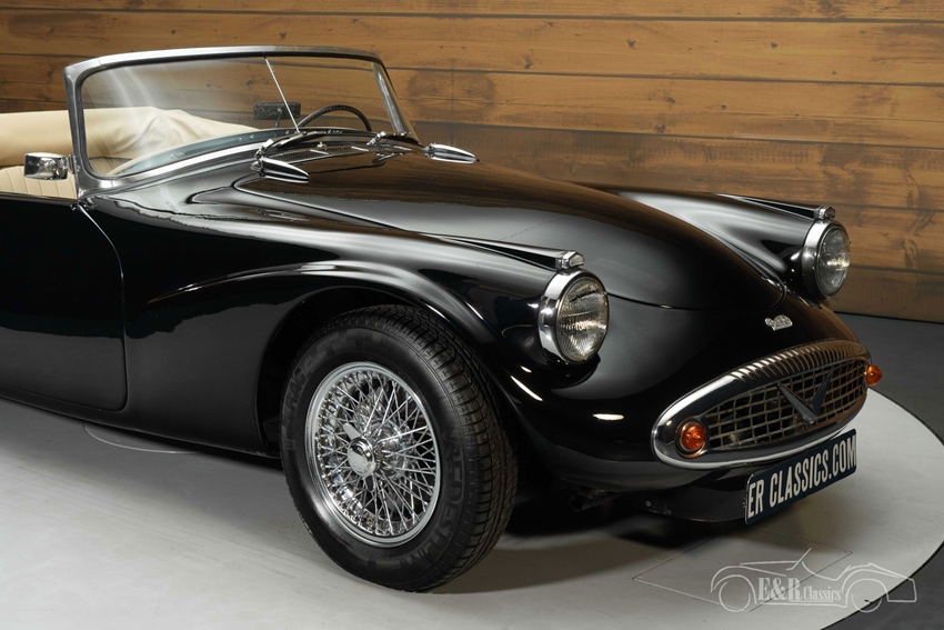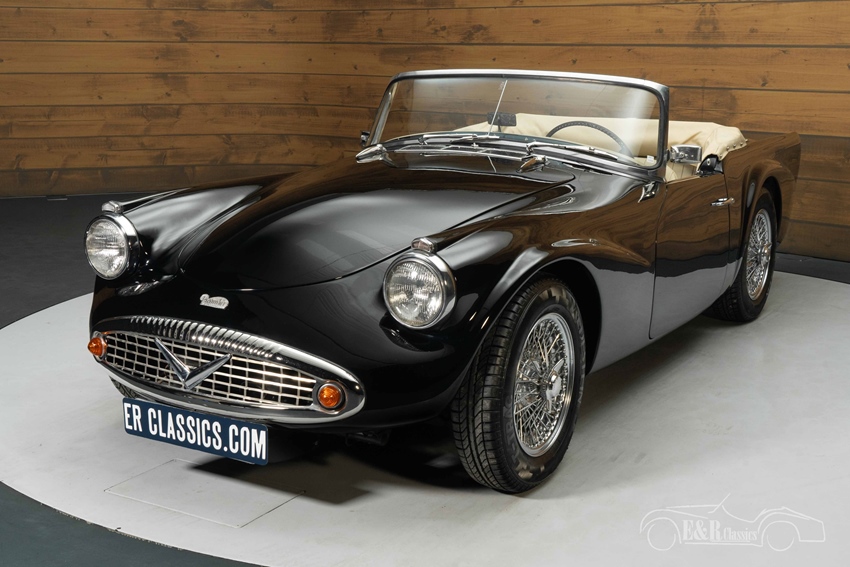 Zwarte Daimler SP250 Dart te koop Deze Daimler SP250 straalt pure elegantie uit met zijn diepzwarte lakwerk, chroomwerk en schitterende chromen spaakwielen. Het contrasterende beigekleurige interieur en bijpassende soft top zorgen voor een verfijnde en stijlvolle uitstraling. Het interieur biedt een perfect voorbeeld van klassieke Britse luxe, met aandacht voor detail en comfort. Deze auto combineert tijdloze schoonheid met rijplezier, waardoor het een perfecte keuze is voor de liefhebber van unieke klassiekers.