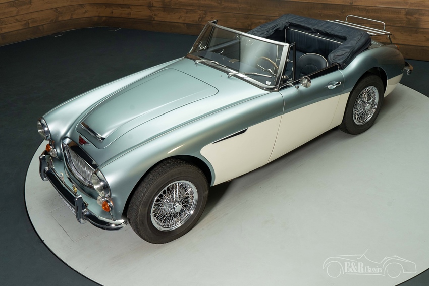 Austin Healey 3000 MK3 in Ice Blue en Old English White te koop Het elegante Ice Blue en Old English White lakwerk straalt klasse en authenticiteit uit, terwijl de chromen spaakwielen, het kofferrek en de badge bar de klassieke uitstraling versterken. De donkerblauwe soft top past perfect bij het luxueuze interieur, waar een houten Moto Lita sportstuur de sfeer van een echte Britse roadster compleet maakt. Deze Austin-Healey is een unieke combinatie van stijl, historie en rijplezier, klaar om bewonderd én gereden te worden.