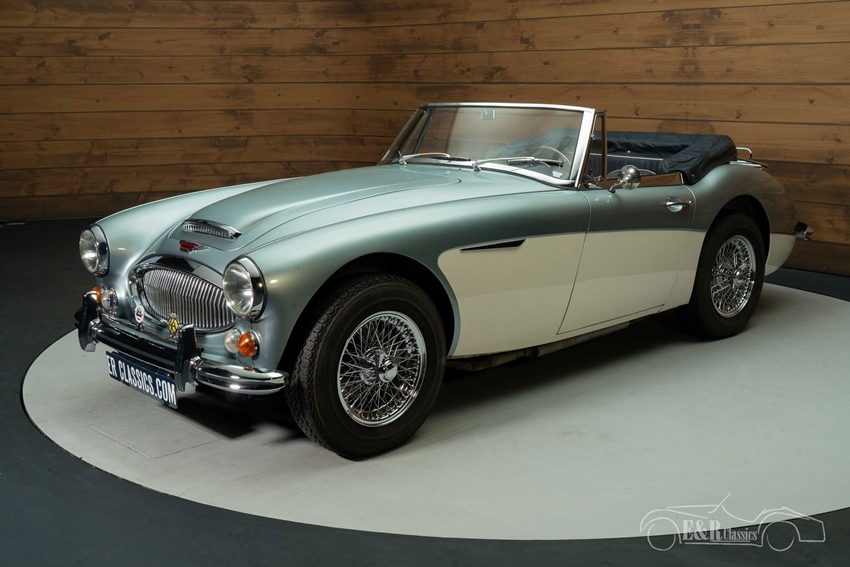 Austin Healey 3000 MK3 in Ice Blue en Old English White te koop Het elegante Ice Blue en Old English White lakwerk straalt klasse en authenticiteit uit, terwijl de chromen spaakwielen, het kofferrek en de badge bar de klassieke uitstraling versterken. De donkerblauwe soft top past perfect bij het luxueuze interieur, waar een houten Moto Lita sportstuur de sfeer van een echte Britse roadster compleet maakt. Deze Austin-Healey is een unieke combinatie van stijl, historie en rijplezier, klaar om bewonderd én gereden te worden.