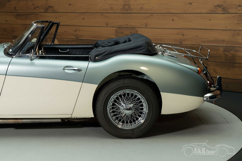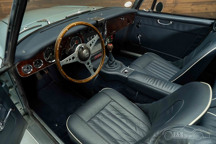 Austin Healey 3000 MK3 in Ice Blue en Old English White te koop Het elegante Ice Blue en Old English White lakwerk straalt klasse en authenticiteit uit, terwijl de chromen spaakwielen, het kofferrek en de badge bar de klassieke uitstraling versterken. De donkerblauwe soft top past perfect bij het luxueuze interieur, waar een houten Moto Lita sportstuur de sfeer van een echte Britse roadster compleet maakt. Deze Austin-Healey is een unieke combinatie van stijl, historie en rijplezier, klaar om bewonderd én gereden te worden.