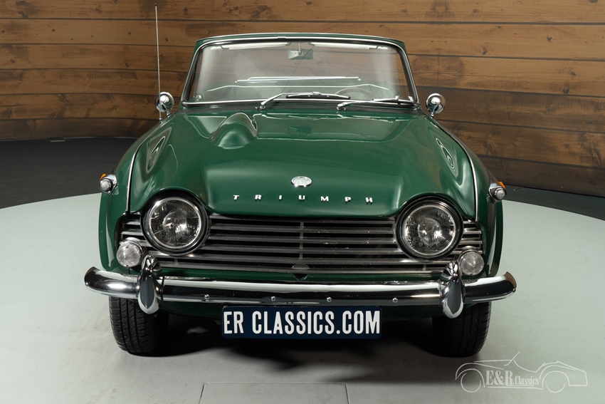 Triumph TR4 in British Racing Green te koop Het exterieur van deze TR4 is gespoten in de iconische British Racing Green, een kleur die perfect past bij de sportieve en tijdloze uitstraling van de auto. De zwarte soft top voegt een stijlvol contrast toe en zorgt ervoor dat je in alle weersomstandigheden kunt genieten van deze cabriolet. Het chromen kofferrek en de stalen velgen met chromen deksels versterken de klassieke uitstraling. Het interieur is al even indrukwekkend, met een combinatie van zwarte bekleding met witte piping en een prachtig houten dashboard. Het sportstuur voegt een extra vleugje elegantie en authenticiteit toe, waardoor het rijplezier nog verder wordt verhoogd.
