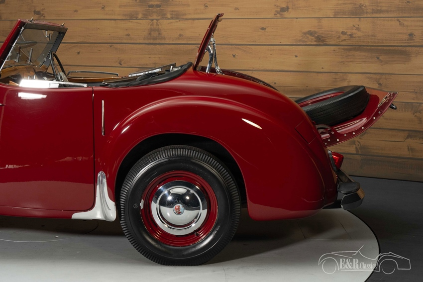 Bordeaux rode Triumph Roadster 2000 te koop Qua uitstraling is deze Triumph Roadster 2000 een echte blikvanger. De carrosserie is uitgevoerd in diep bordeauxrood lakwerk, wat prachtig contrasteert met de zwarte soft top en de verchroomde accenten. De klassieke stalen velgen met originele wieldoppen maken het geheel af. Het interieur ademt Britse elegantie met zijn grijze lederen bekleding en prachtig houten dashboard, waarin de klassieke instrumenten stijlvol zijn verwerkt. Een tijdloze klassieker die niet alleen rijplezier biedt, maar ook een investering in exclusiviteit is.