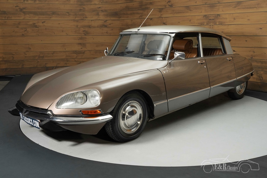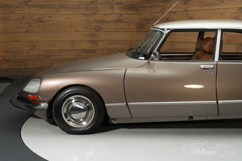 Citroën DSuper 5 te koop bij E&R Classics De prachtige beigekleurige metallic lak combineert perfect met het bruine lederen Pallas interieur, wat zorgt voor een chique en tijdloze uitstraling. De chromen details, originele wieldoppen en gestroomlijnde vorm geven de DSuper 5 een elegante en karaktervolle look. Het interieur straalt klasse uit, met comfortabel gevoerde stoelen en een klassiek dashboard dat perfect past bij de unieke sfeer van deze Citroën.