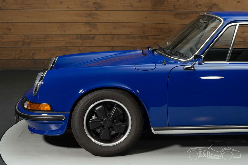 Blauwe Porsche 911T Coupe 2.4 te koop Het koetswerk is uitgevoerd in een opvallende blauwe lak die prachtig contrasteert met het strakke zwarte lederen interieur. De originele Fuchs velgen maken het tijdloze silhouet compleet en benadrukken de sportieve elegantie van dit model. Binnenin straalt het interieur dezelfde klasse uit, met fraai gerestaureerde bekleding, een klassiek dashboard en originele details die perfect harmoniëren met het exterieur. Deze Porsche 911T combineert esthetiek, vakmanschap en historie voor een unieke rijervaring.