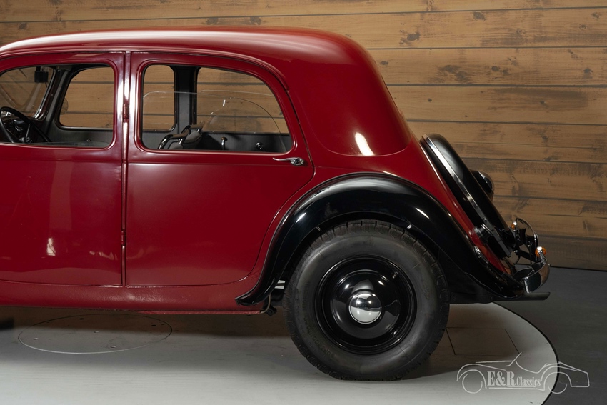 Citroën Traction Avant 7C met zeldzame opties te koop Het exterieur van deze Traction Avant is een lust voor het oog. De diep rode lak gecombineerd met zwarte spatborden en wielen zorgt voor een elegante uitstraling. Dit model heeft enkele zeldzame kenmerken, zoals koplampsteunen zonder stelgaten, een reservewieldeksel uit drie delen en bumpersteunen met slechts één bout in plaats van twee. De authentieke benzinetank met twee vuldoppen en het nummerbord met verlichting ("Plaque de Police") onderstrepen de originele details. Binnenin straalt het interieur pure klasse uit, met twee dashboardkastjes, een originele centrale instrumentatie en een speciaal vervaardigde binnenspiegel. Bovendien is het uitzetkompas voor het raam nog origineel, een detail dat zelden wordt teruggevonden. De hoogwaardige bekleding, geweven volgens de traditionele Franse methode, zorgt voor een perfect samenspel met het exterieur.