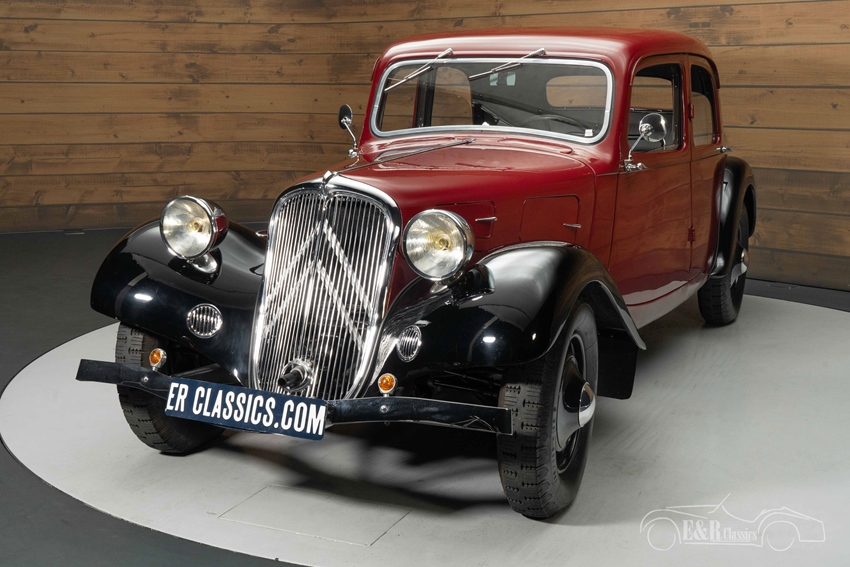 Citroën Traction Avant 7C met zeldzame opties te koop Het exterieur van deze Traction Avant is een lust voor het oog. De diep rode lak gecombineerd met zwarte spatborden en wielen zorgt voor een elegante uitstraling. Dit model heeft enkele zeldzame kenmerken, zoals koplampsteunen zonder stelgaten, een reservewieldeksel uit drie delen en bumpersteunen met slechts één bout in plaats van twee. De authentieke benzinetank met twee vuldoppen en het nummerbord met verlichting ("Plaque de Police") onderstrepen de originele details. Binnenin straalt het interieur pure klasse uit, met twee dashboardkastjes, een originele centrale instrumentatie en een speciaal vervaardigde binnenspiegel. Bovendien is het uitzetkompas voor het raam nog origineel, een detail dat zelden wordt teruggevonden. De hoogwaardige bekleding, geweven volgens de traditionele Franse methode, zorgt voor een perfect samenspel met het exterieur.
