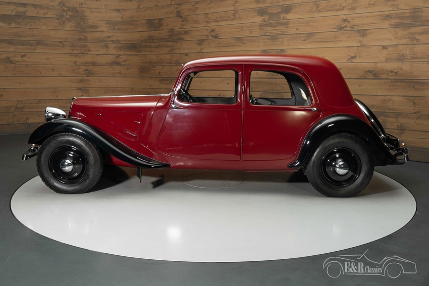 Citroën Traction Avant 7C met zeldzame opties te koop Het exterieur van deze Traction Avant is een lust voor het oog. De diep rode lak gecombineerd met zwarte spatborden en wielen zorgt voor een elegante uitstraling. Dit model heeft enkele zeldzame kenmerken, zoals koplampsteunen zonder stelgaten, een reservewieldeksel uit drie delen en bumpersteunen met slechts één bout in plaats van twee. De authentieke benzinetank met twee vuldoppen en het nummerbord met verlichting ("Plaque de Police") onderstrepen de originele details. Binnenin straalt het interieur pure klasse uit, met twee dashboardkastjes, een originele centrale instrumentatie en een speciaal vervaardigde binnenspiegel. Bovendien is het uitzetkompas voor het raam nog origineel, een detail dat zelden wordt teruggevonden. De hoogwaardige bekleding, geweven volgens de traditionele Franse methode, zorgt voor een perfect samenspel met het exterieur.