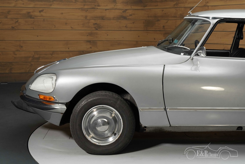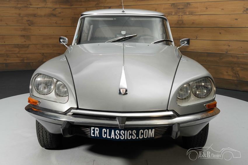 Citroën DS 23 Pallas met Citromatic versnellingsbak te koop Het zilvergrijze lakwerk staat de elegante carrosserievorm perfect en laat de gestroomlijnde lijnen prachtig tot hun recht komen. De originele wieldoppen en verfijnde chroomaccenten geven de auto zijn klassieke uitstraling. Binnenin ademt het interieur karakter: het zwarte leren interieur toont een fraai patina dat het rijke verleden van deze auto weerspiegelt. Het kenmerkende éénspaaks stuurwiel en de chique afwerking van de deurpanelen maken het samenspel tussen binnen- en buitenkant compleet. Een zeldzame combinatie van stijl, techniek en geschiedenis – klaar voor een liefhebber met oog voor originaliteit.