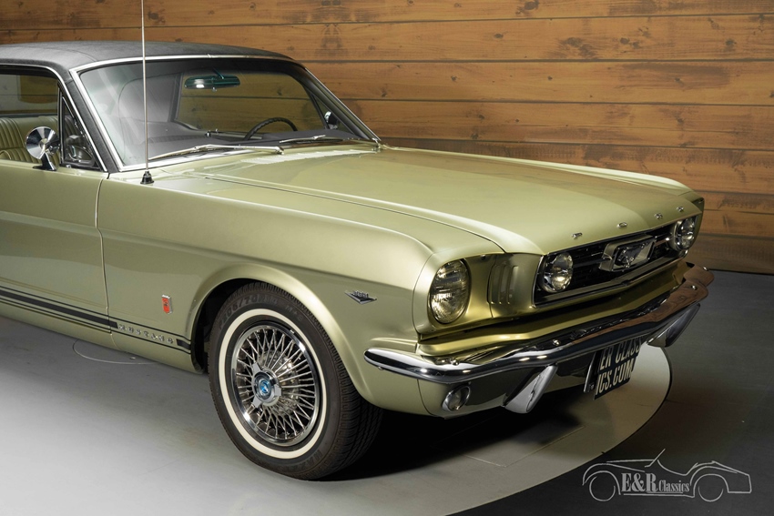 Ford Mustang GT uit 1966 in Sauterne Gold Metallic te koop Het uiterlijk van deze Mustang is een lust voor het oog. De carrosserie is gespoten in zeldzame Sauterne Gold Metallic, perfect gecombineerd met een kunstlederen dak in zwart. Langs de flanken loopt de karakteristieke GT-striping, en op de voorspatborden prijken de originele GT-emblemen. De grille wordt gesierd door twee heldere 10 cm mistlampen – een kenmerkend GT-detail. Binnenin gaat de luxe verder met het Ivy Gold/White Pony-interieur, compleet met imitatiehouten stuurwiel, middenconsole, Rally Pack tellers, AM-radio met 8-track stereo en originele Ford airconditioning. Ramen met rondom groen getint veiligheidsglas en talloze extra's maken dit tot een waar collectors item.