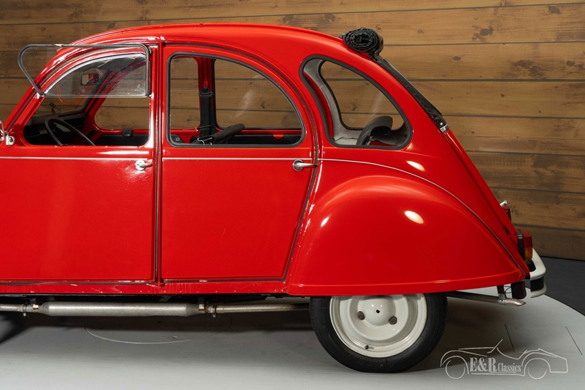 Rode Citroën 2CV te koop Qua uiterlijk is deze 2CV in rood lakwerk uitgevoerd, wat prachtig samengaat met het zwart interieur. Het zwart roldakje voegt een speelse en open ervaring toe, ideaal voor zomerritten. De auto heeft het klassieke karakter van de 2CV behouden, met een opvallende uitstraling dankzij de karakteristieke wielkasten en het ronde design. Het interieur is eenvoudig maar charmant, met zwarte bekleding die perfect past bij de buitenkant. De handgeschakelde 4-versnellingsbak maakt de rijervaring authentiek en zorgt voor volledige controle over de compacte motor.