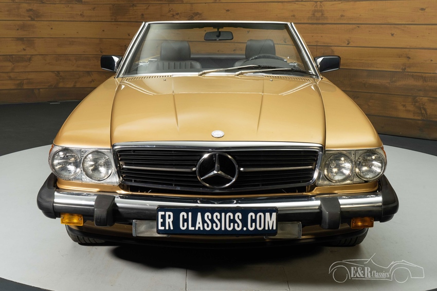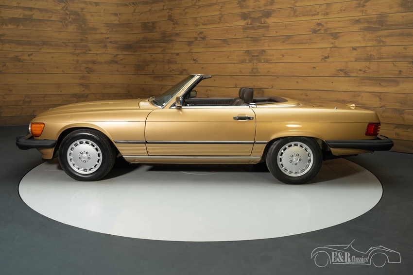 Goudkleurige Mercedes-Benz 560SL te koop Qua uitstraling is deze 560SL een echte blikvanger. Het goudkleurige lakwerk oogt tijdloos en chique, zeker in combinatie met de lichtmetalen velgen en de donkere soft top. De auto wordt geleverd met zowel een hardtop als een softtop, waardoor hij het hele jaar door inzetbaar is. Het interieur is uitgevoerd in stijlvol donkerbruin, dat prachtig contrasteert met de goudkleur en zorgt voor een warm, klassiek gevoel. Het dashboard met houtinleg en de analoge klokken benadrukken het hoogwaardige karakter van deze cabriolet. Alles bij elkaar een bijzonder complete en goed bewaarde Mercedes-Benz met een elegante uitstraling.