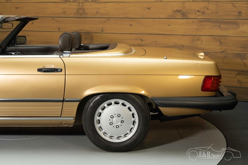 Goudkleurige Mercedes-Benz 560SL te koop Qua uitstraling is deze 560SL een echte blikvanger. Het goudkleurige lakwerk oogt tijdloos en chique, zeker in combinatie met de lichtmetalen velgen en de donkere soft top. De auto wordt geleverd met zowel een hardtop als een softtop, waardoor hij het hele jaar door inzetbaar is. Het interieur is uitgevoerd in stijlvol donkerbruin, dat prachtig contrasteert met de goudkleur en zorgt voor een warm, klassiek gevoel. Het dashboard met houtinleg en de analoge klokken benadrukken het hoogwaardige karakter van deze cabriolet. Alles bij elkaar een bijzonder complete en goed bewaarde Mercedes-Benz met een elegante uitstraling.
