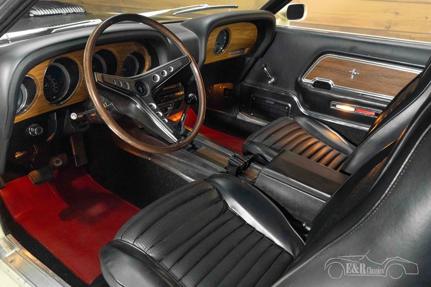 Ford Mustang Fastback Mach 1 428 Cobra Jet met 7.0 liter Cobra Jet motor te koop Qua uiterlijk maakt deze Mustang indruk met zijn crèmekleurige lakwerk en zwarte Mach 1-striping, die prachtig contrasteren met het zwarte kunstlederen interieur. De matzwarte motorkap, de originele velgen met white letter banden, de achterspoiler en louvers maken het plaatje compleet. Binnenin wordt je begroet door klassieke houten inlegpanelen, stoelen met rode accenten en een cockpit die helemaal gericht is op de bestuurder. De harmonie tussen lakwerk en interieur geeft deze Mustang een tijdloze, sportieve uitstraling die je zelden ziet.