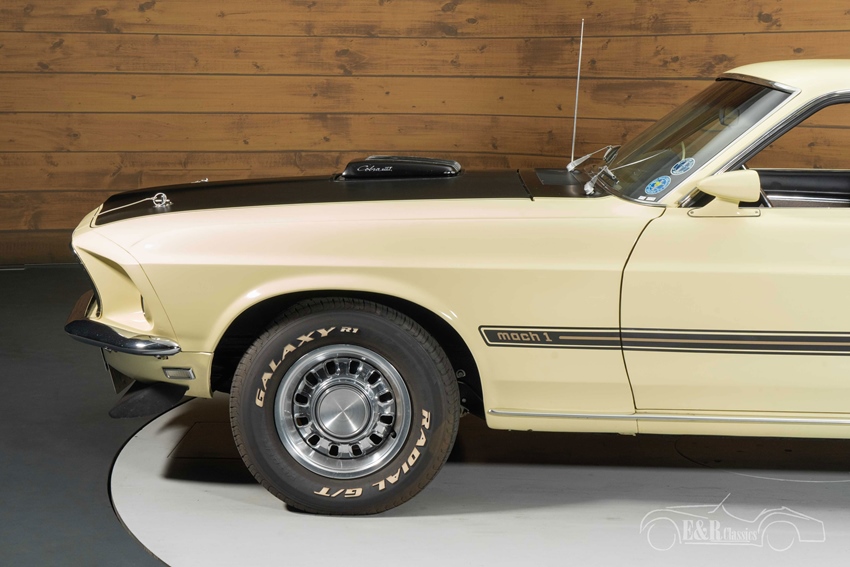 Ford Mustang Fastback Mach 1 428 Cobra Jet met 7.0 liter Cobra Jet motor te koop Qua uiterlijk maakt deze Mustang indruk met zijn crèmekleurige lakwerk en zwarte Mach 1-striping, die prachtig contrasteren met het zwarte kunstlederen interieur. De matzwarte motorkap, de originele velgen met white letter banden, de achterspoiler en louvers maken het plaatje compleet. Binnenin wordt je begroet door klassieke houten inlegpanelen, stoelen met rode accenten en een cockpit die helemaal gericht is op de bestuurder. De harmonie tussen lakwerk en interieur geeft deze Mustang een tijdloze, sportieve uitstraling die je zelden ziet.